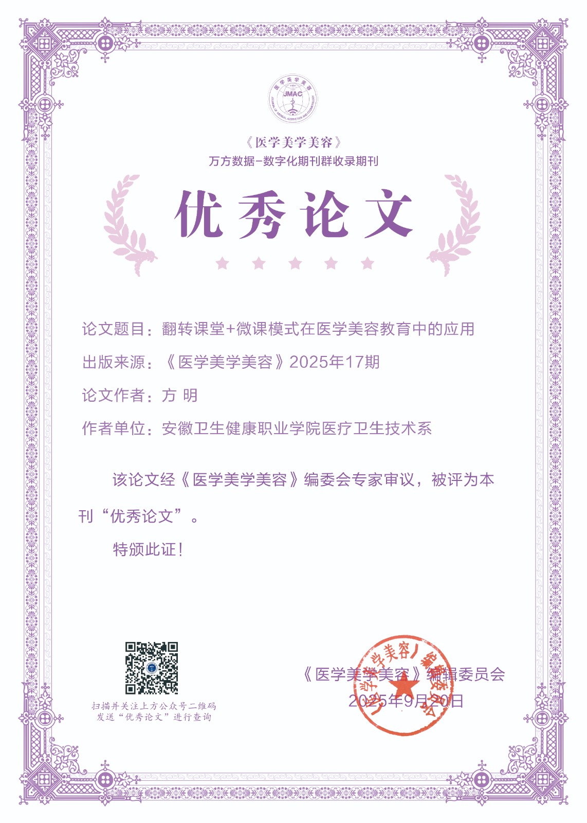 为了进一步激发作者的学术热情,提升理论研究水平,展现医学美容领域先进技术及研究成果,新的一年,我刊大幅度更新了证书样式,并在公众号平台提供证书查询功能,获奖者在公众号对话界面输入论文通讯作者或者第一作者即可查询到获奖证书。另外入选论文信息将在《医学美学美容》纸质期刊、官方网站等渠道同步展示,如需纸质版证书,可联系我部邮寄。经编辑部初评,专家评审,上级批准后,下列论文荣获《医学美学美容》2025年度优秀论文。